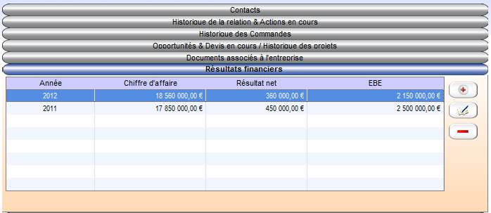 Le commercial peut utiliser ce menu pour y saisir les éléments financiers de l'entreprise. Ceux-ci peuvent venir des sites comme societe.com, verif ou score3.