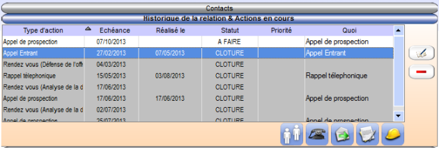 Historique de la relation & Actions en cours permet de lister toutes les actions commerciales associées à cette organisation (y compris celles qui sont associés à un contact ou à une action).
